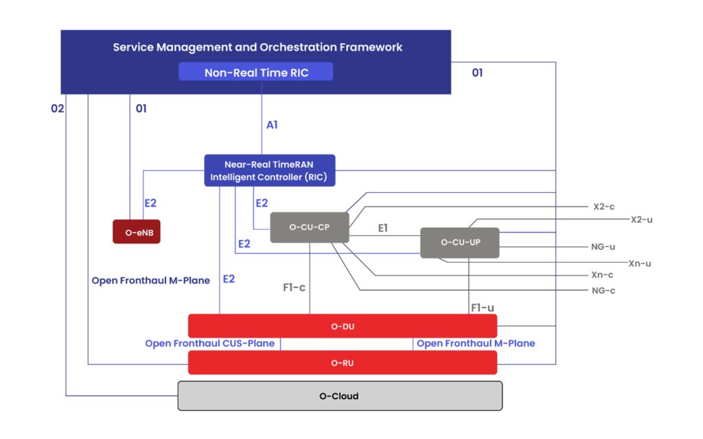 According to O-RAN Alliance, the Open RAN architecture as shown in Figure 2, comprises the following key components and interfaces.